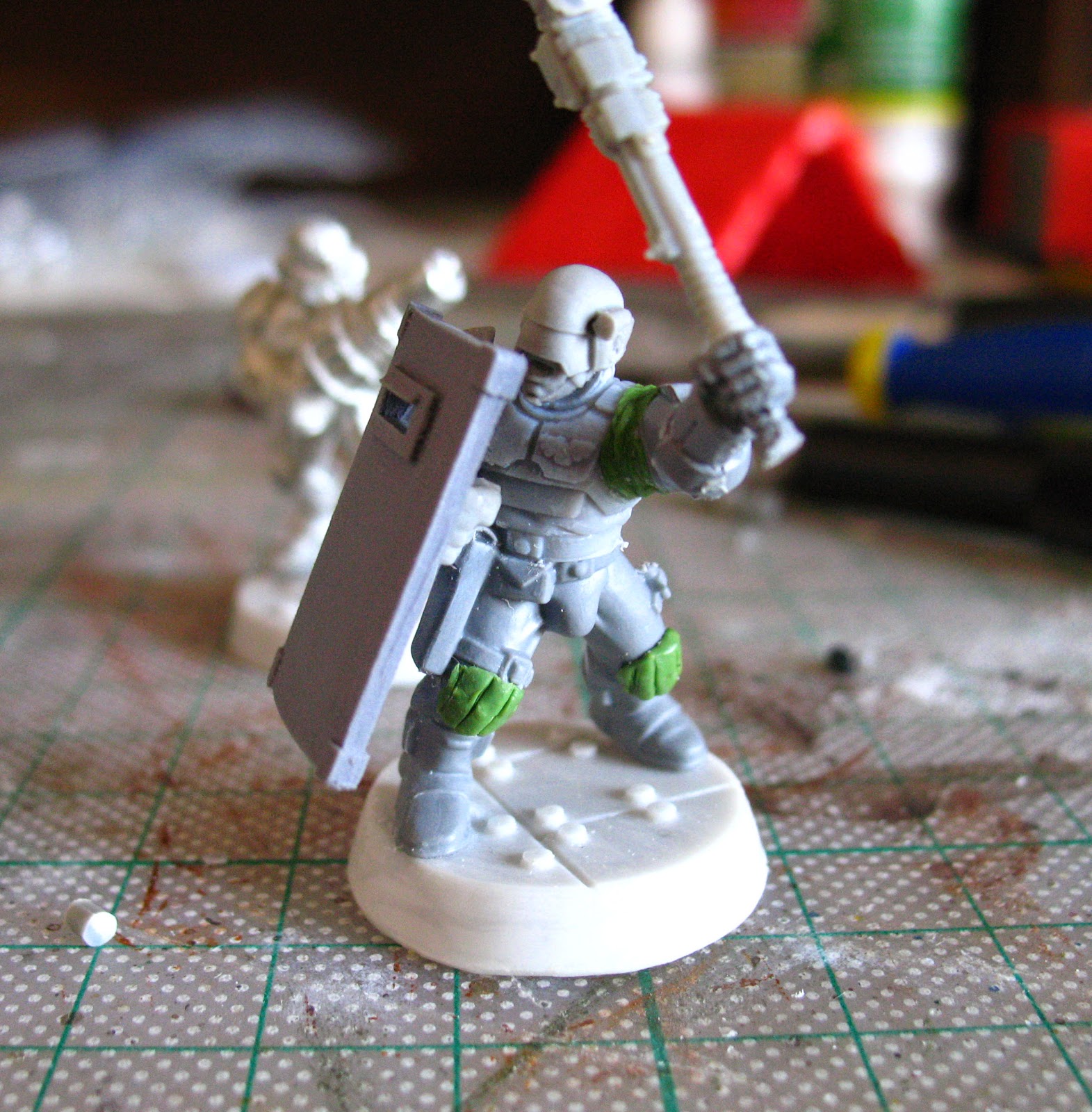 For the rest of the conversion, I used Space Marines Scout legs, Cadian torsos and various hands from space marines and Cadians with greenstuff to achieve the pose I wanted. Finally the power mauls are made from Berzerker chainaxes and power axes, with the axe chopped off. I finished the models using resin bases from Models and Minis.